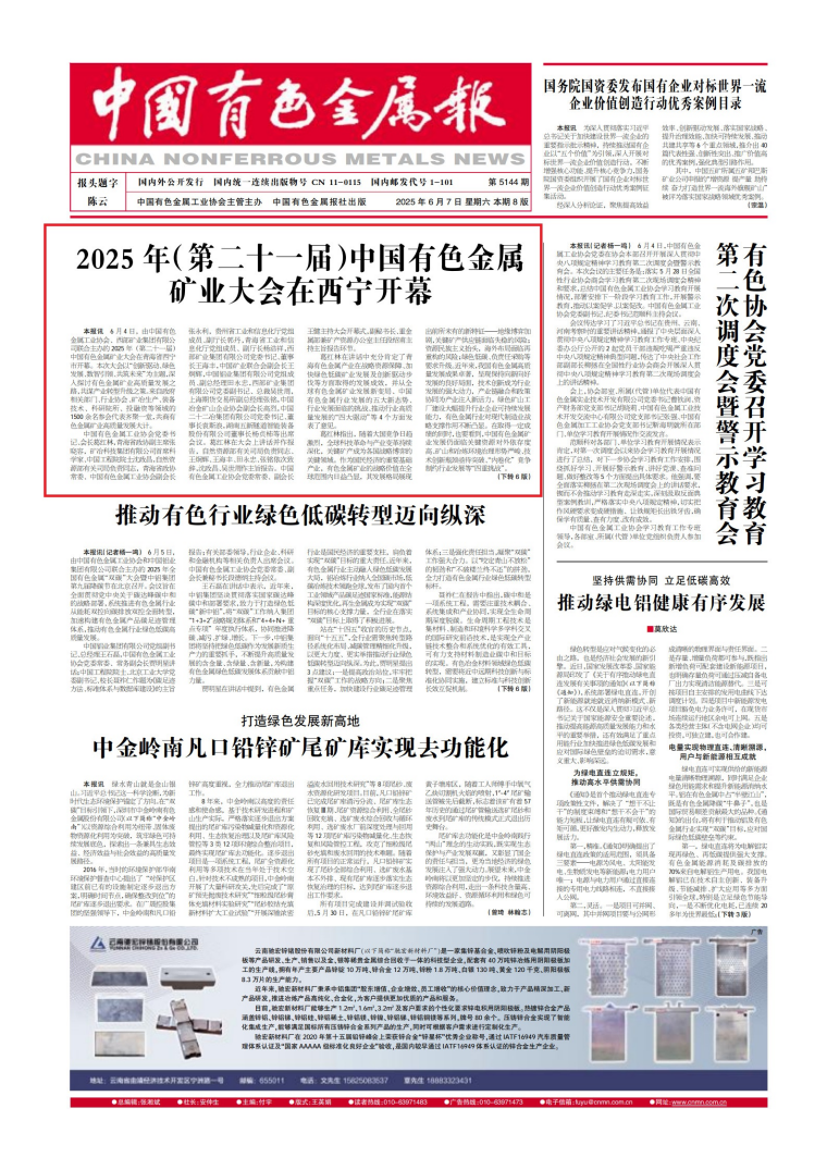 本报讯 6月4日,由中国有色金属工业协会、西部矿业集团有限公司联合主办的2025年(第二十一届)中国有色金属矿业大会在青海省西宁市开幕。本次大会以“创新驱动、绿色发展、数智引领、共筑未来”为主题,深入探讨有色金属矿业高质量发展之路,共谋产业转型升级之策。来自政府相关部门、行业协会、矿冶生产、装备技术、科研院所、投融资等领域的1500余名参会代表齐聚一堂,共商有色金属矿业高质量发展大计。