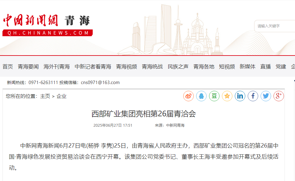 中新网青海新闻6月27日电(杨骅 李隽)25日,由青海省人民政府主办,西部矿业集团公司冠名的第26届中国·青海绿色发展投资贸易洽谈会在西宁开幕。该集团公司党委书记、董事长王海丰受邀参加开幕式及后续活动。
