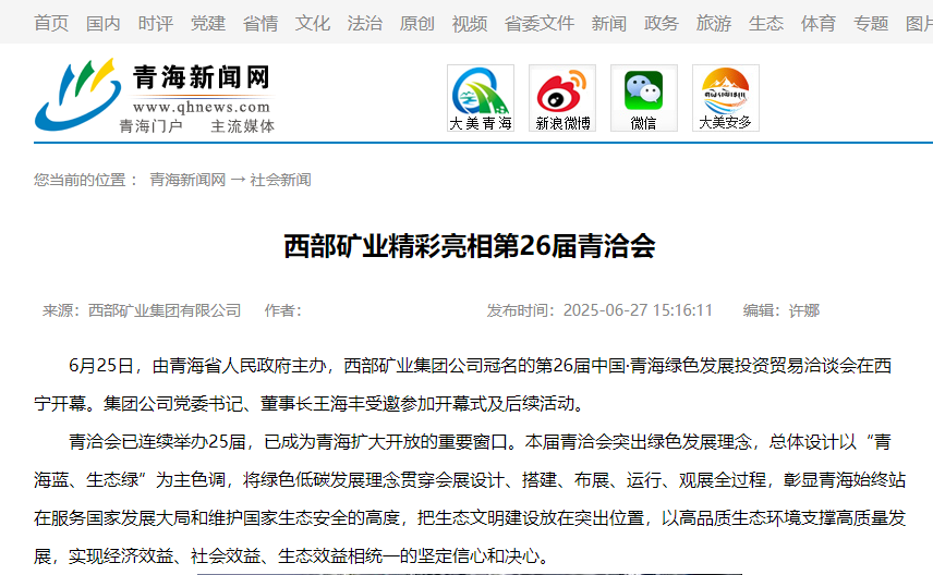 6月25日,由青海省人民政府主办,西部矿业集团公司冠名的第26届中国·青海绿色发展投资贸易洽谈会在西宁开幕。集团公司党委书记、董事长王海丰受邀参加开幕式及后续活动。
