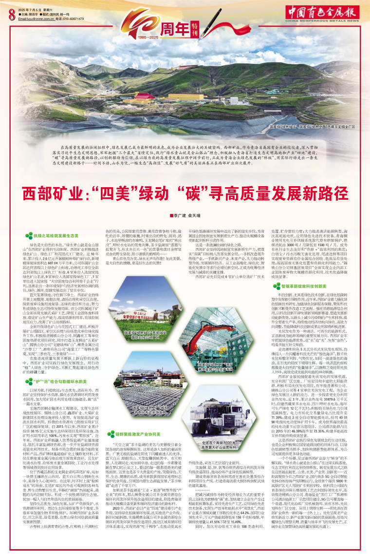 在高质量发展的壮阔征程中,绿色发展已成为最鲜明的底色,成为企业发展壮大的关键密码。西部矿业,作为青海省属国有企业的佼佼者,深入贯彻落实习近平生态文明思想,牢牢把握“三个最大”省情定位,践行“绿水青山就是金山银山”理念,积极融入青海省打造生态文明高地和产业“四地”建设,“碳”寻高质量发展新路径,以创新驱动为引领,在以绿为底的高质量发展征程中阔步前行,正成为青海企业绿色发展的“样板”,用实际行动走出一条生态文明建设新路子……时间不语,山水为凭,一幅生态“高颜值”、发展“好气质”的美丽画卷正在西部矿业渐次展开。